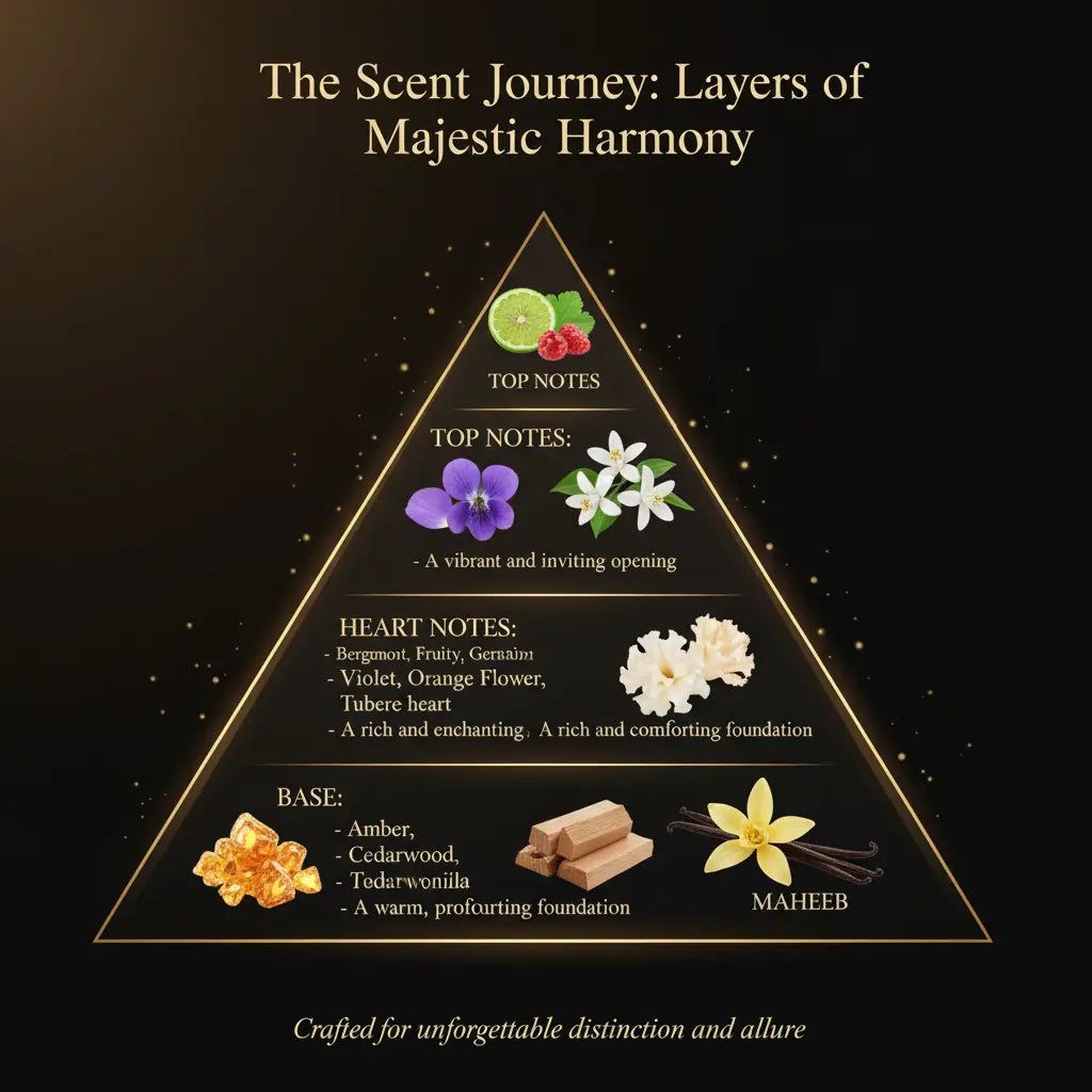 Indulge in the exquisite allure of Maheeb Eau de Parfum, with a generous quantity of 200ML, a luxurious fragrance that captivates the senses with its enchanting blend of floral, ambery, and woody fragrance. The top notes are of vibrant bergamot, succulent fruits, and blossoming geranium that creates a refreshing opening, while the heart reveals a sumptuous bouquet of violet, orange flower, and tuberose, spritz of pure elegance, as the scent unfolds to the base of amber, cedarwood and vanilla creating a trail very much unforgettable.